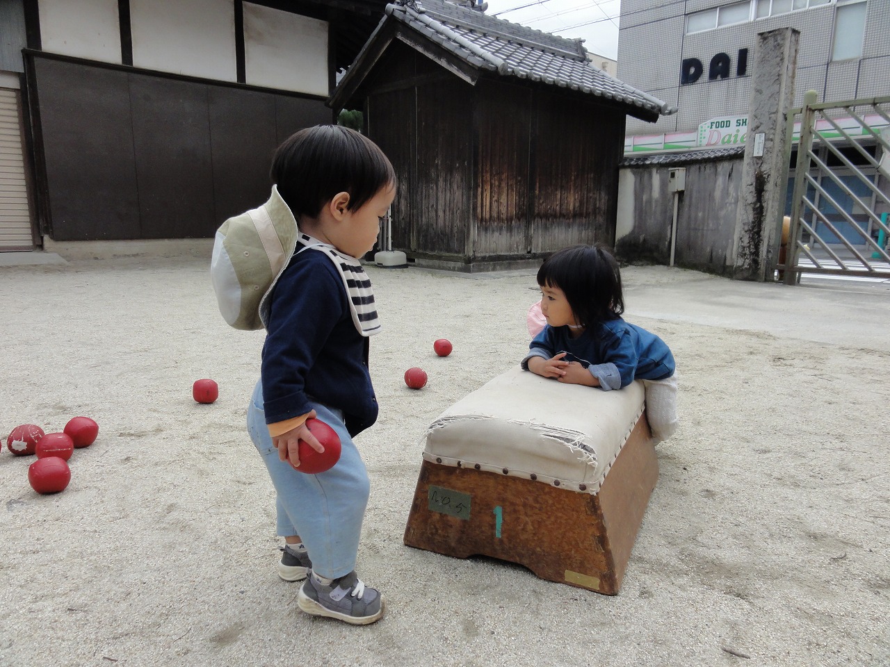 マットで坂道を作って遊びました!何回か同じ遊びをしているので、準備をしている段階から集まってくるひよこ組さん。