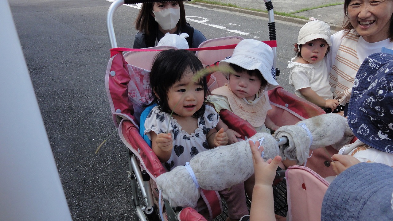 ねこじゃらしを見つけ「どうぞ!」と手渡すと、これは何なんだろう?と不思議そうに見たり、楽しそうにブンブンと振ってる子もいて、とっても可愛らしかったです(*^^)