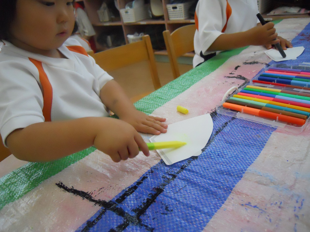他にも、三角と丸の折り紙をのりはりしたり、服にシールを貼ったりと、たくさん製作しました。