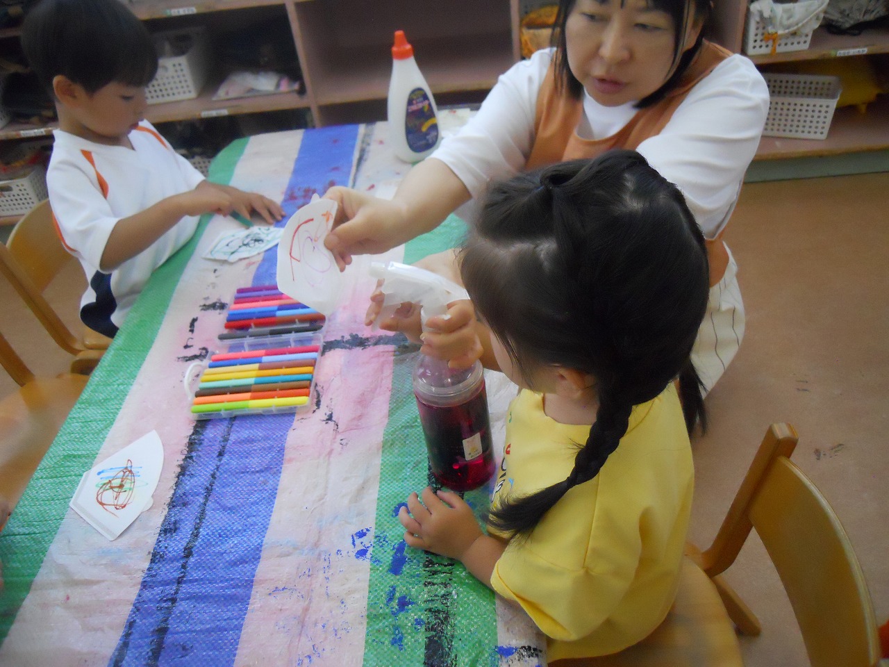 あひるぐみさんで、七夕の製作をしました。コーヒーフィルターにペンで絵を描いて、霧吹きで水をかけにじみ絵をしたり、綿棒に白い絵の具をつけ、天の川を描いたりしました。