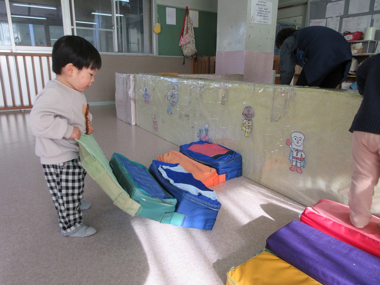 階段マットを一生懸命運び、そこに登って向こう側を見ていました。お友だちが運んで登っている姿を見て「ぼくもやりたい!」と真似する姿もありました。この日はマットでしたが、おもちゃの箱を逆さまに置いてそこに登ろうとする姿もあります!